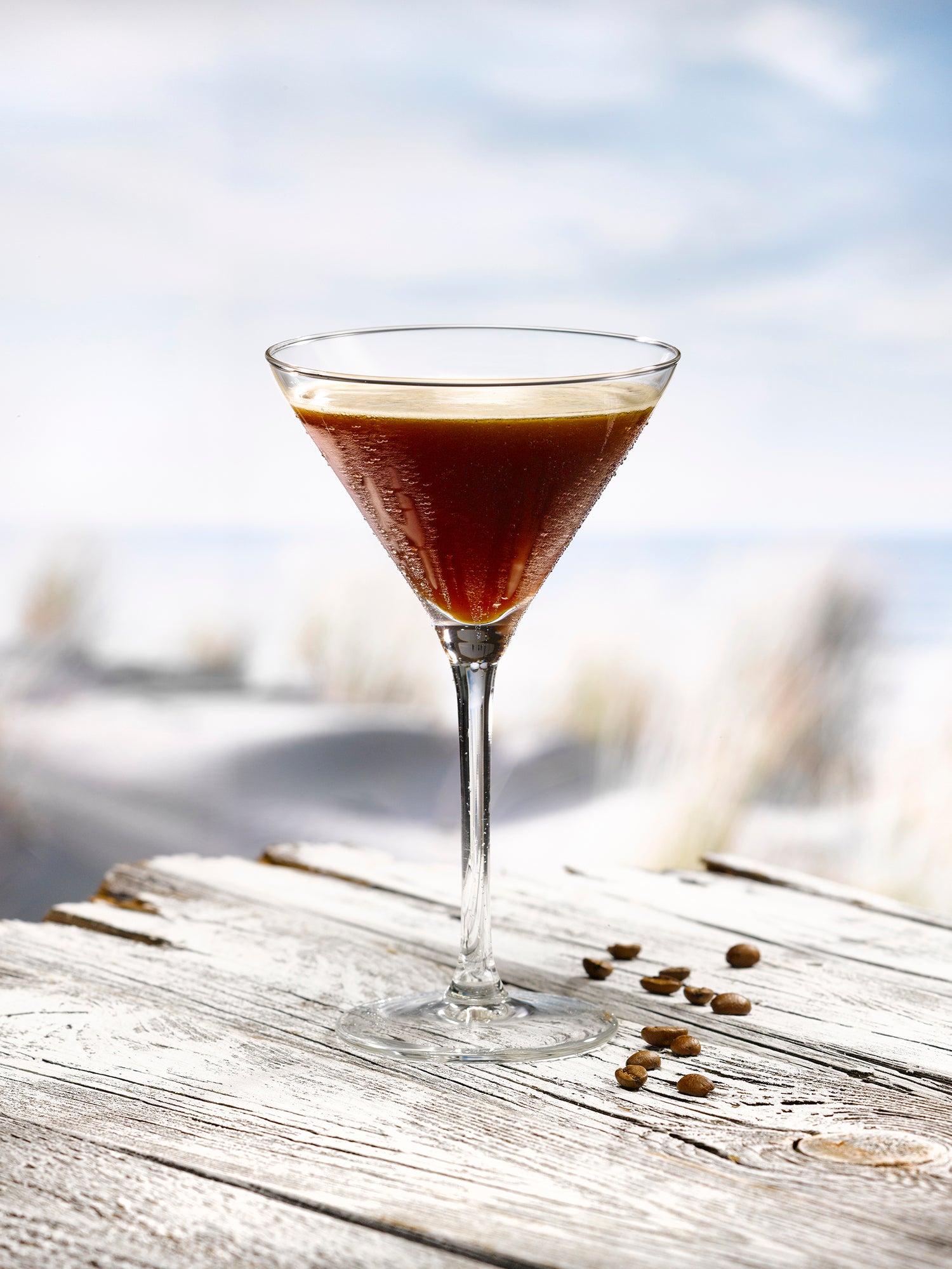 - Durch ein Barsieb in ein gekühltes Martiniglas abseihen.